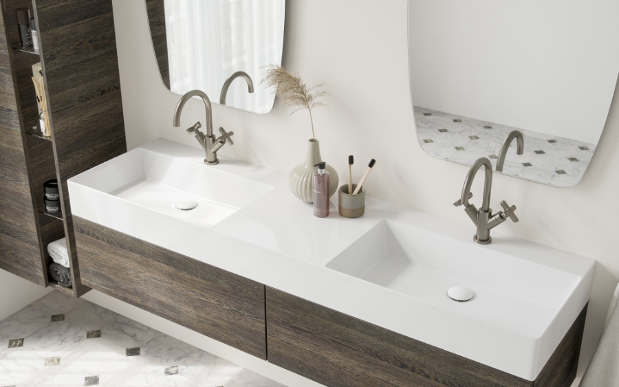 Het keramische wastafelblad is al leverbaar in de breedtematen 60, 80, 102, 122 en 142 centimeter en wordt nu uitgebreid met een versie van 162 centimeter. Voorzien van 2 ruime waskommen en een fijne afzetruimte voor uw zeepjes, handdoeken en overige accessoires.
