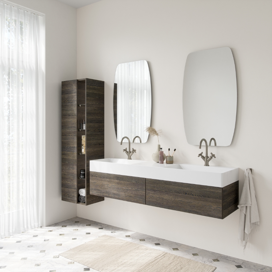 De bijbehorende wastafelkast (2x 80,6 cm.) zorgt voor een geheel met 2 of 4 luxe laden. Vanzelfsprekend mogelijk in alle greepvoeringen en 40 kleuren.