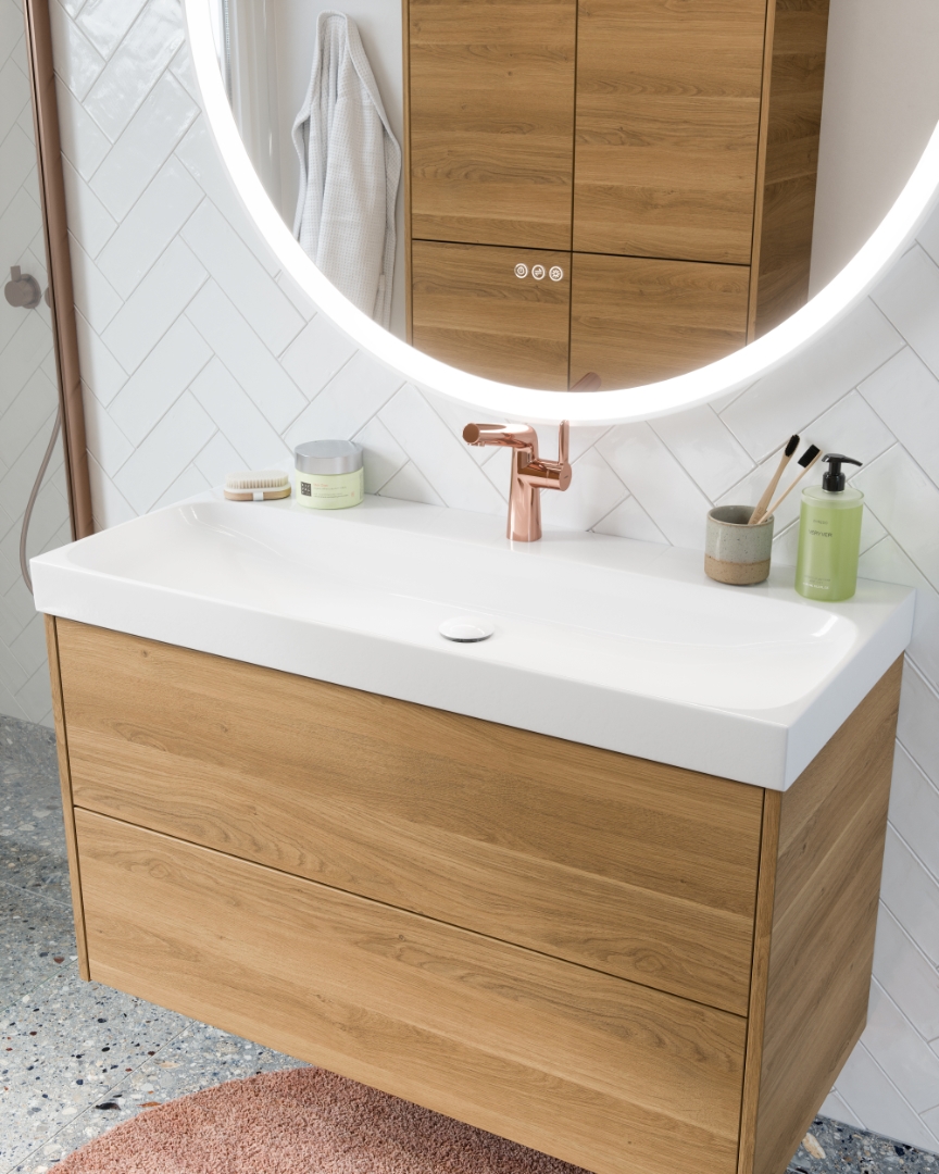 Breng de zonsopgang je badkamer binnen met de nieuwe Sunrise serie. Het keramische wastafelblad wordt gekenmerkt door zijn strakke lijnen en ruime ronde kom. De ronde vorm voegt een zachte, organische dimensie toe aan het strakke ontwerp, waardoor er een harmonieuze balans ontstaat tussen vorm en functionaliteit.